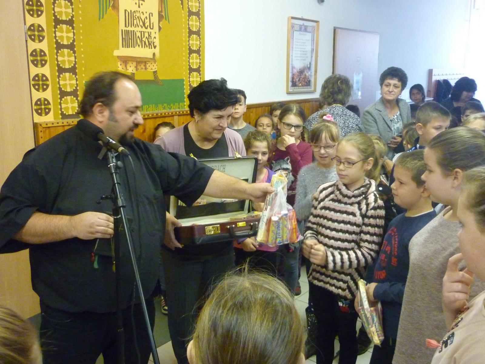 Hétfőn reggel a lelki percek alkalmával már kaptak a diákok egy kódfejtő feladványt, melyet, ha megfejtenek, egy táskát tudnak kinyitni. Ezen a délutánon természetesen az első osztályosoké volt a főszerep, hiszen őket avattuk „Szent Mihályos” diákokká, „Csibeavató” ünnepségünkön. Ehhez – a szokásoknak megfelelően, de mindig újabb – próbákat kellett kiállniuk. A játékos sorversenyeket nagyon élvezték, amikbe a két osztályfőnököt is bevonták a szervezők. Az izgalmas és vidám verseny után, Gólya Györgyné intézményvezető kötötte meg a megszentelt nyakkendőket és sálakat. Ezt követően esküt mondtak, majd közös tánccal zárult a program, melybe a közönség is bekapcsolódott. A felső tagozatosok játékos vetélkedőkön, filmvetítésen vehettek részt, a nyolcadik évfolyamosoknak pedig Pályaorientációs nap keretében mutatkozott be a Szent Bazil, valamint a Szent László középiskola.
