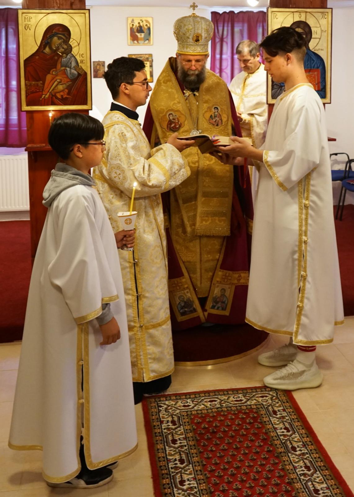 Fülöp metropolita atya érkezett hozzánk, hogy megáldja az elkövetkezendő szertartásaink új helyszínét és elhelyezze az Antimenziont. Utrenyénk és liturgiánk fényét emelte jelenlétével és közreműködésével a közösségi életünk szerves részévé vált püspök, amiért messzemenően hálásak vagyunk az Úrnak és Fülöp atyának is. Prédikációjában párhuzamot vont a menyegzőre - és a mai meghívottak helyzetével. Tanítása tiszta és érthető volt mindenki számára.