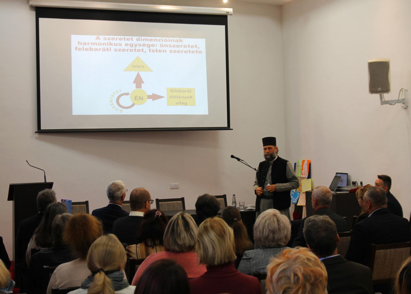 A lelki nap Dr. Papp Miklós tanszékvezető, főiskolai tanár (Sapientia Szerzetesi Hittudományi Főiskola) előadásával folytatódott, amelynek alapgondolata arra épült, hogy a szeretetszolgálat munkatársai szeretetet visznek a „terepre”, az ellátórendszer intézményeibe. Majd párhuzamot vont a filozófus Platón és Jézus Krisztus között, akik szintén a terepen beszélgetett az emberekkel. - Óriási dolog terepre menni és ott beszélgetni az elesettekkel, hasonlóan a betegek ágya mellett helyt állni.