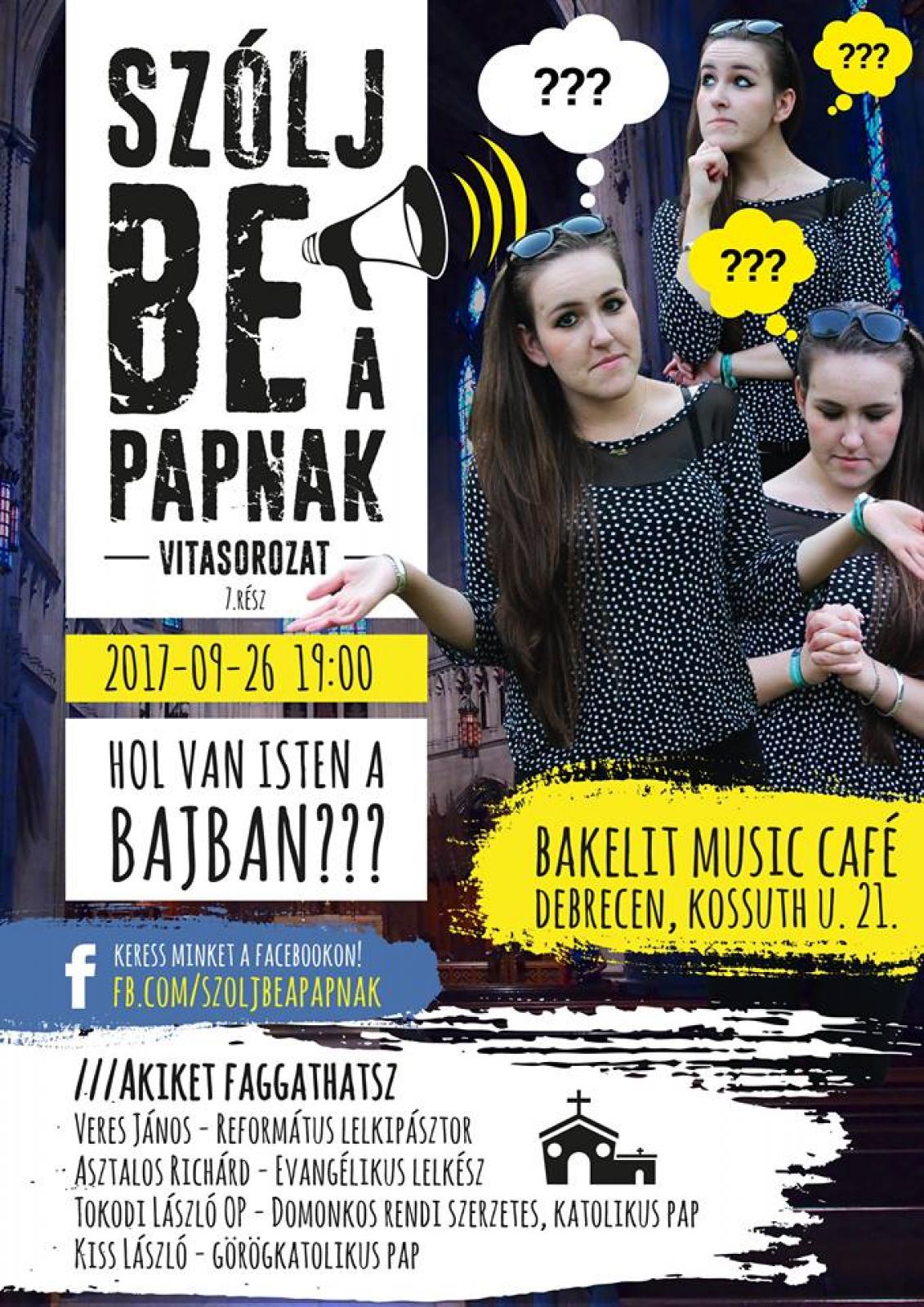 A vitasorozat 7. része Debrecenben lesz a Bakelit Music Café-ban, szeptember 26-án, kedden 19.00 órai kezdettel. A nagy kérdéskör: Hol van Isten a bajban? Akiket kérdezhetnek: Veres János református lelkész, Asztalos Richárd evangélikus lelkész, Tokodi László OP Domonkos Rendi szerzetes, és Kiss László görögkatolikus lelkész.
