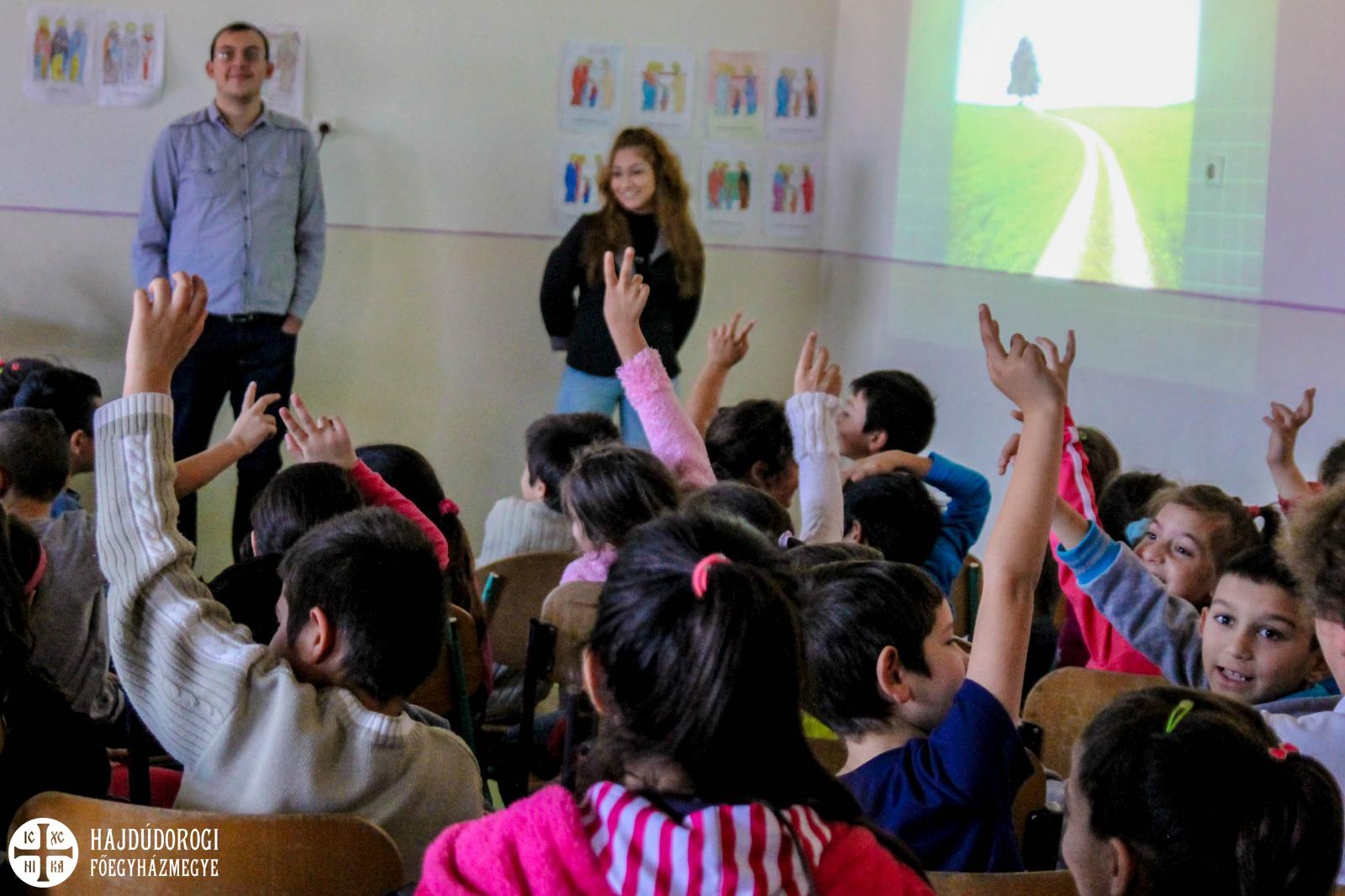 Látogatásunk azonban nem csak ajándékozásról szólt; három szakkollégistánk (Makula Szandra, Molnár Zoltán és Kóti Tibor) tanulási motivációs előadást tartott a diákoknak. Az interaktív előadás során körülbelül száz gyermekben igyekeztünk gondolatokat ébreszteni a tanulás fontosságával kapcsolatban, az üzenetet a szakkollégisták életútjuk bemutatásával tették hitelessé.