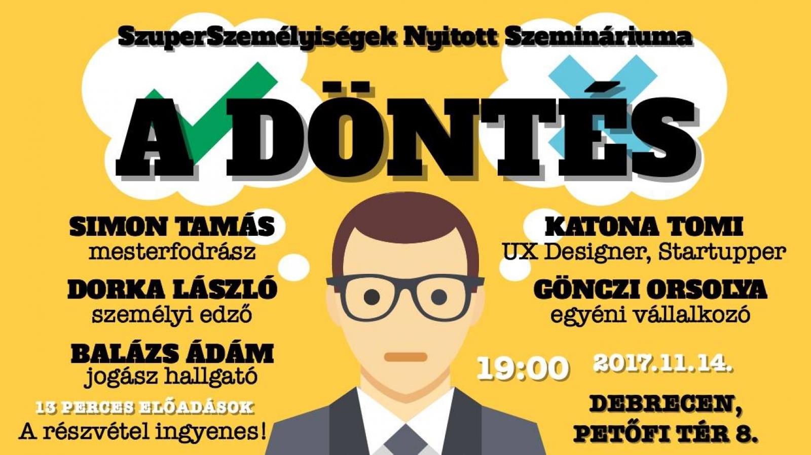 Különleges estének lehetnek tanúi azok, akik ellátogatnak az Érseki Hivatalba Debrecenben. Ez lesz a SzuperSzemélyiségek Nyitott Szemináriuma, amelyen öt előadó számol be saját történetéről. A téma: A DÖNTÉS lesz. 5 előadó szerepel a programban, 13 perces előadásokkal. Egy barátságos, nyitott Önfejlesztő közösség várja az érdeklődőket.