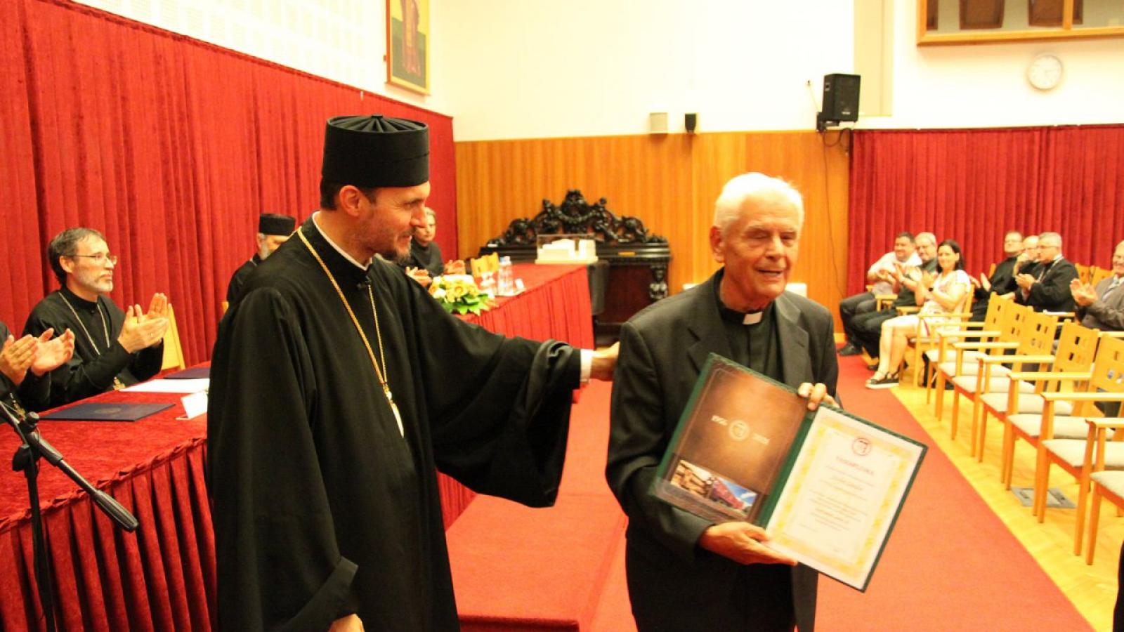 A Szent Atanáz Görögkatolikus Hittudományi Főiskola a 2020. évben az Eperjesi Egyetem Teológiai Fakultása professzor emeritusának, Bohács Béla atyának adományozta a Szent Atanáz-díjat. Tavaly előbb a pandémia, majd Béla atya elhunyta miatt nem tudták átadni a díjat. Most felesége és fia vették át a plakettet és oklevelet Fülöp érsektől.