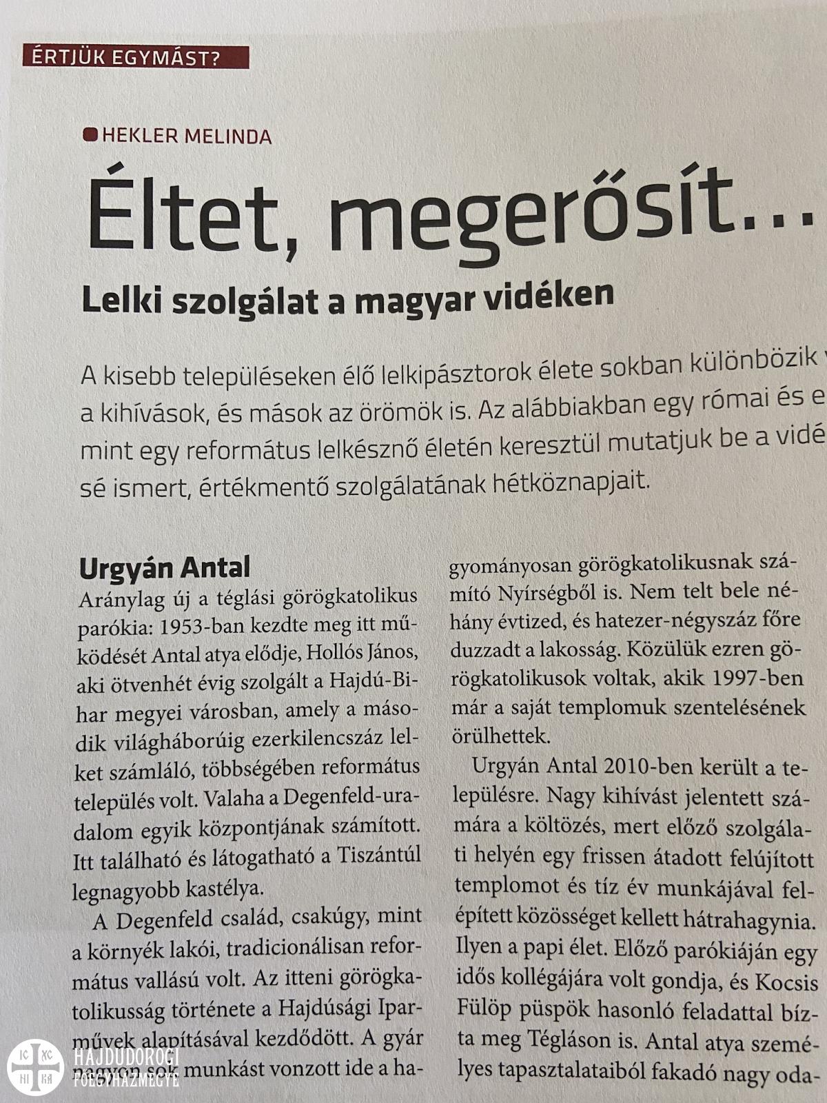 „Urgyán Antal 2010-ben került a településre. Nagy kihívást jelentett számára a költözés, mert előző szolgálati helyén egy frissen átadott felújított templomot és tíz év munkájával felépített közösséget kellett hátrahagynia. Ilyen a papi élet. Előző parókiáján egy idős kollégájára volt gondja, és Kocsis Fülöp püspök hasonló feladattal bízta meg Tégláson is. Antal atya személyes tapasztalataiból fakadó nagy odafigyeléssel és szívvel végezte a feladatot. „Két nagyszülőmet is mi gondoztuk otthon a szülői házban, mindenkinek ki kellett vennie belőle a részét, a mindennapi feladataink elvégzése mellett.” Amikor egy év múlva az idős pap meghalt, Antal atya albérletét a parókiára cserélte. A költözést alapos felújítás előzte meg, amelynek hatalmas közösségszervező ereje volt. „Nagyon sok pénzt megspóroltunk azzal, hogy miután kihirdettük a templomban a felújítás elindulását, azonnal életerős fiatalemberek jöttek kalákában dolgozni. Munka közben főztünk, beszélgettünk, és ebből jó kis közösség alakult.”…