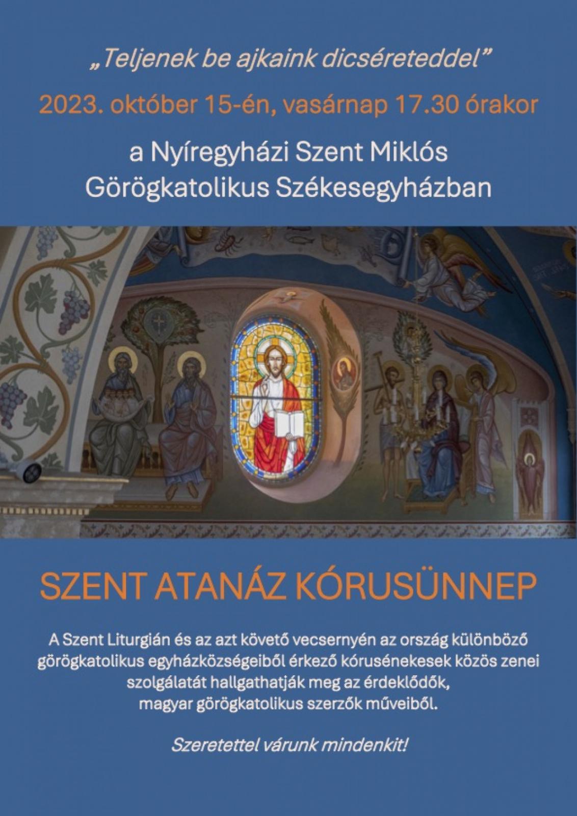 Ezzel a címmel rendeznek 2023. október 15-én, vasárnap 17:30 órai kezdettel a nyíregyházi Szent Miklós-székesegyházban Szent Atanáz Kórusünnepet