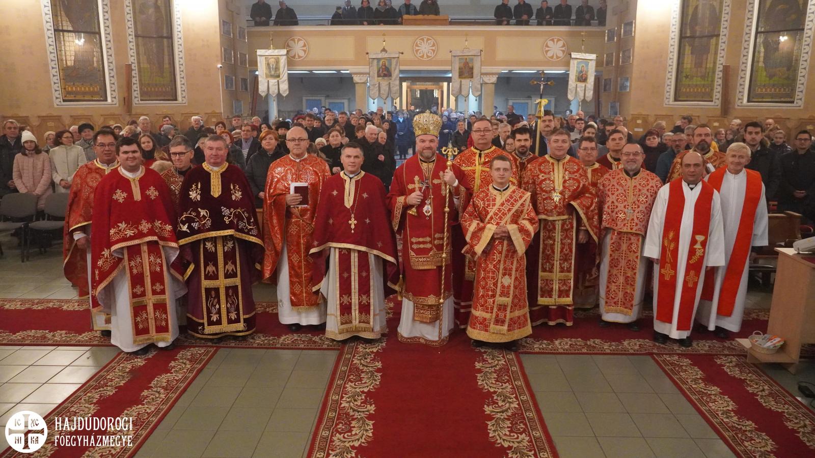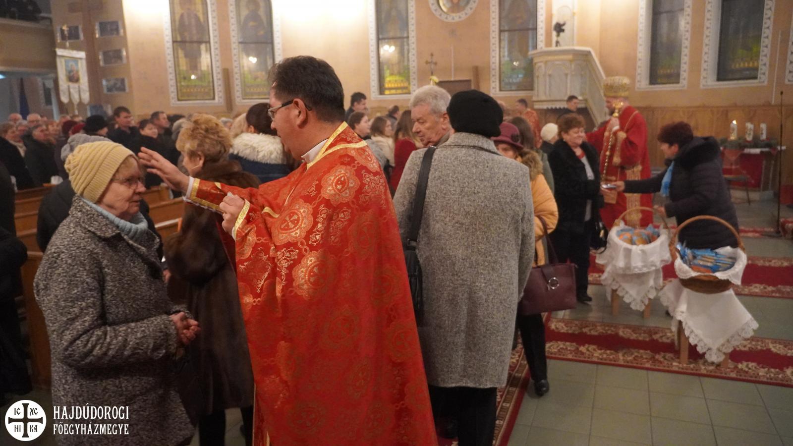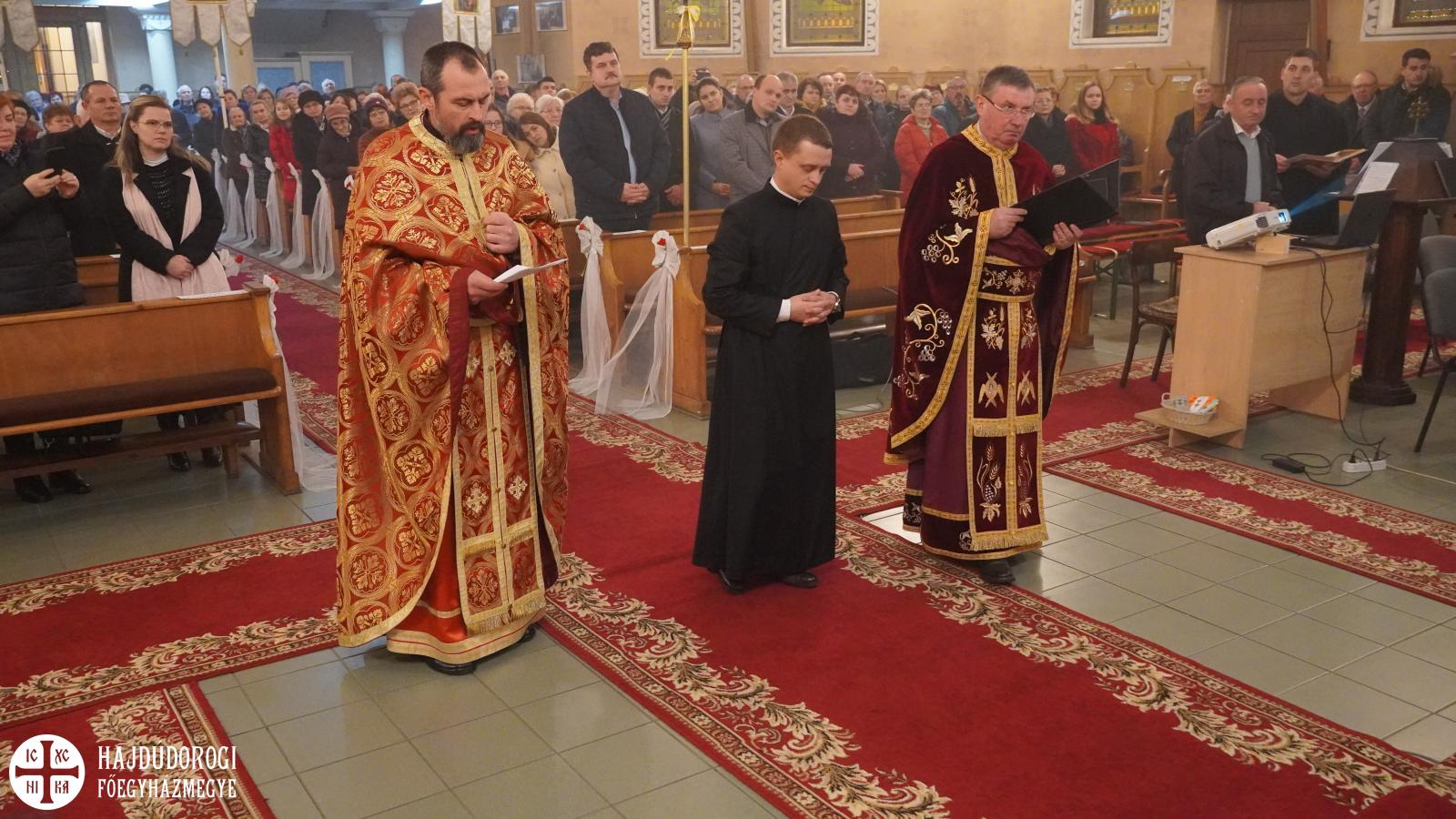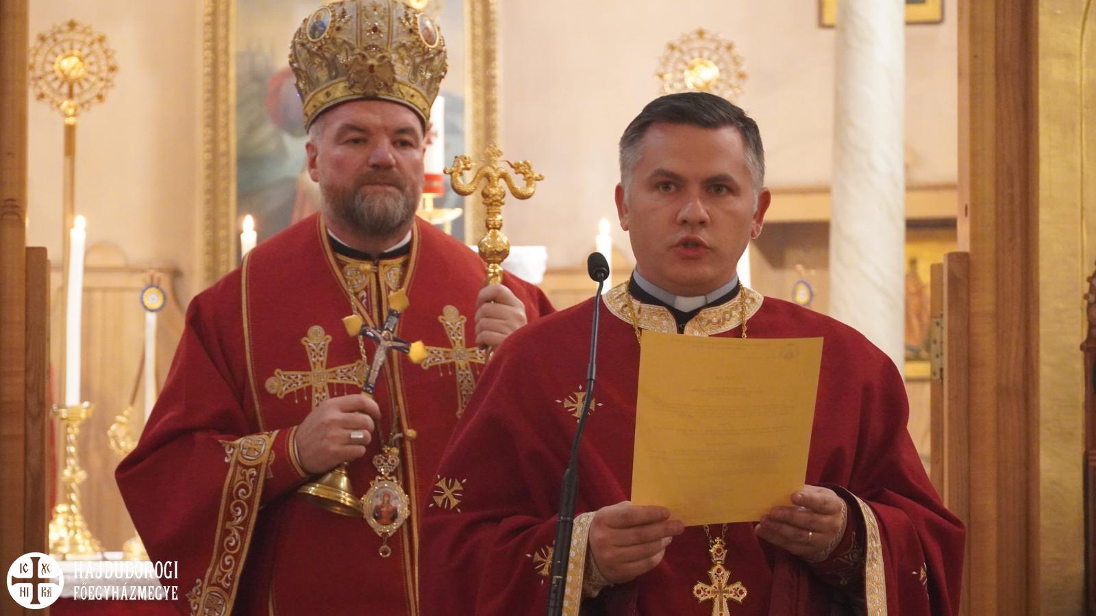 „Ünnepnap van – mondta a főpásztor – és az ünnep egyben öröm is, az öröm pedig Istennek az emberi szívekben végzett munkájának érezhető jele. (…) Az ember szentségre hivatott. Álljunk meg ezért egy pillanatra a szentség fogalmánál. Jelenlétemet ma este ezen az örömünnepen, elsősorban a templombúcsú maga indokolja. Azt akartam, hogy együtt imádkozzunk, főpásztor, pap, hívek. Az egyház imádkozik, a közösség ünnepel, és ez is jele a hitnek, imádságnak és kegyelemnek. Másodsorban azért vagyok jelen ma este ebben a templomban, hogy diakónussá szenteljek egy fiatalembert, Nagy Csongort, ennek a magyar görögkatolikus vidéknek a szülöttét, aki az egyházi rend diakónusi fokozatát kapja. Egy fiatalember vállalja a diakonátust abban a reményben, hogy a papságra történő készület újabb lépcsőfokára léphessen. Ebben is ott van a szentségre való meghívás kenetének illata. Harmadik ok, amiért itt vagyok ma este az, hogy kinevezzem és beiktassam hivatalába ennek a közösségnek az új parókusát. Mindezek az okok ahhoz vezetnek bennünket, ami a mai ünneplésnek az lényege, nevezetesen a szentség keresése és a szentségben való élet.” A főpásztor kifejtette többek között, hogy az új diakónus felszentelése az egyház megújulásának és erősödésének is jele, amely frissességet hoz, ugyanakkor arra buzdítja a közösséget, hogy az ima és a támogatás révén közel tudjon maradni papjához, aki többek között az atya szerepét is betölti a közösségben. A Szent Liturgiában a megyéspüspök megemlékezett id. Pallai Béláról is, aki 33 évig szolgálta a szatmári görögkatolikus híveket.