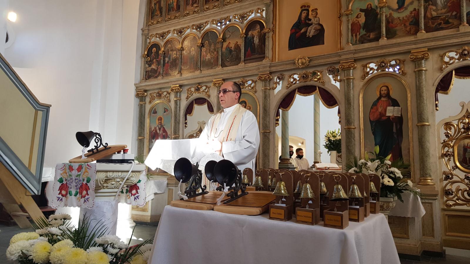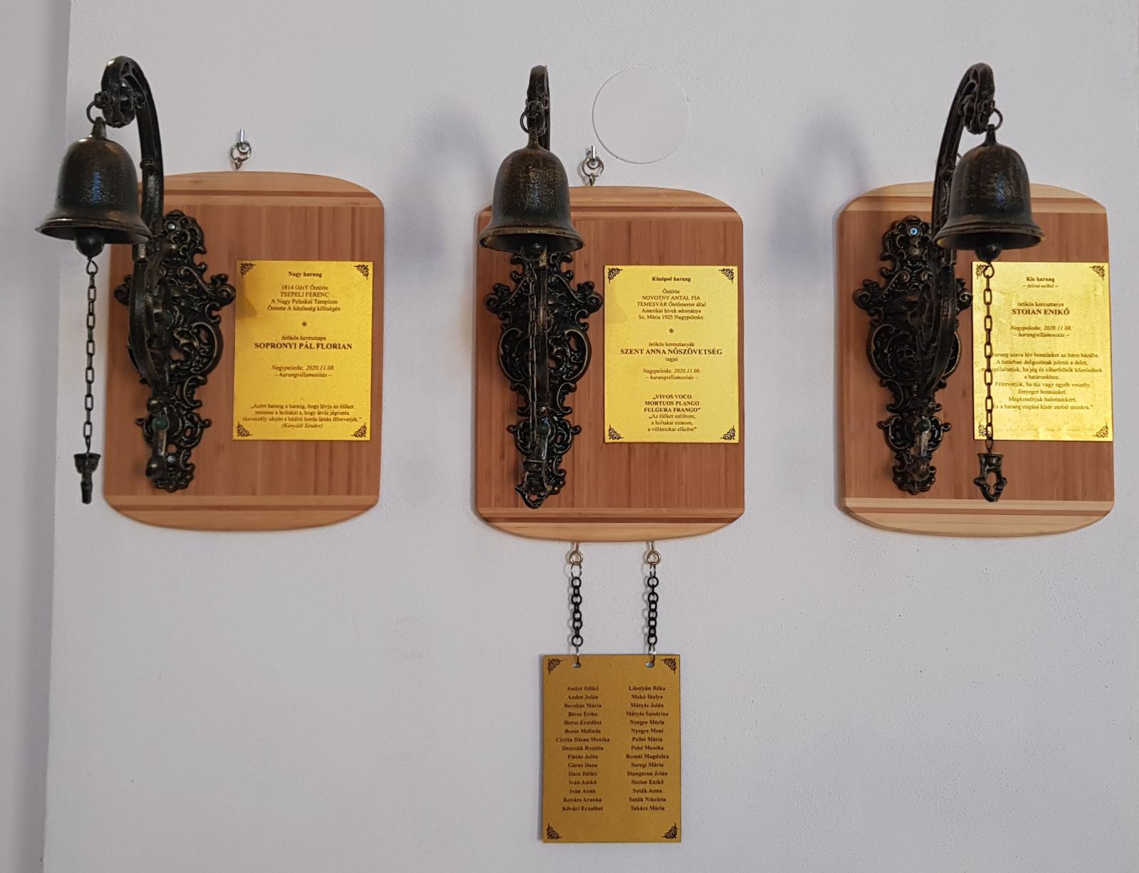 A Szent Liturgia végén következett a harangvillamosítás megáldása és az emlékplakettek kiosztása. A korábban megtartott „licit” eredménye szerint a nagy harang keresztapja Sopronyi Pál Florian lett, aki a peleskei származású édesapja emlékére támogatta a szerelési munkálatokat. A középharang keresztanyai tisztségét a Szent Anna Nőszövetség tagjai vállalták fel, amihez elnökasszonyuk Libotyán Réka bőkezű pluszfelajánlást tett. A kisharang keresztanya szerepét Stoian Enikő kapta, ehhez családtagjai Fehér József és Kővári László önzetlen adományai társultak.