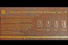 A gránittáblára négy bronz dombormű került, melyek Páljános Ervin szobrászművész alkotásai: balról jobbra haladva dr. Dudás Miklós alapító püspök és a főiskola három elhunyt rektora: dr. Liki János, dr. Bacsóka Béla és dr. Pregun István.