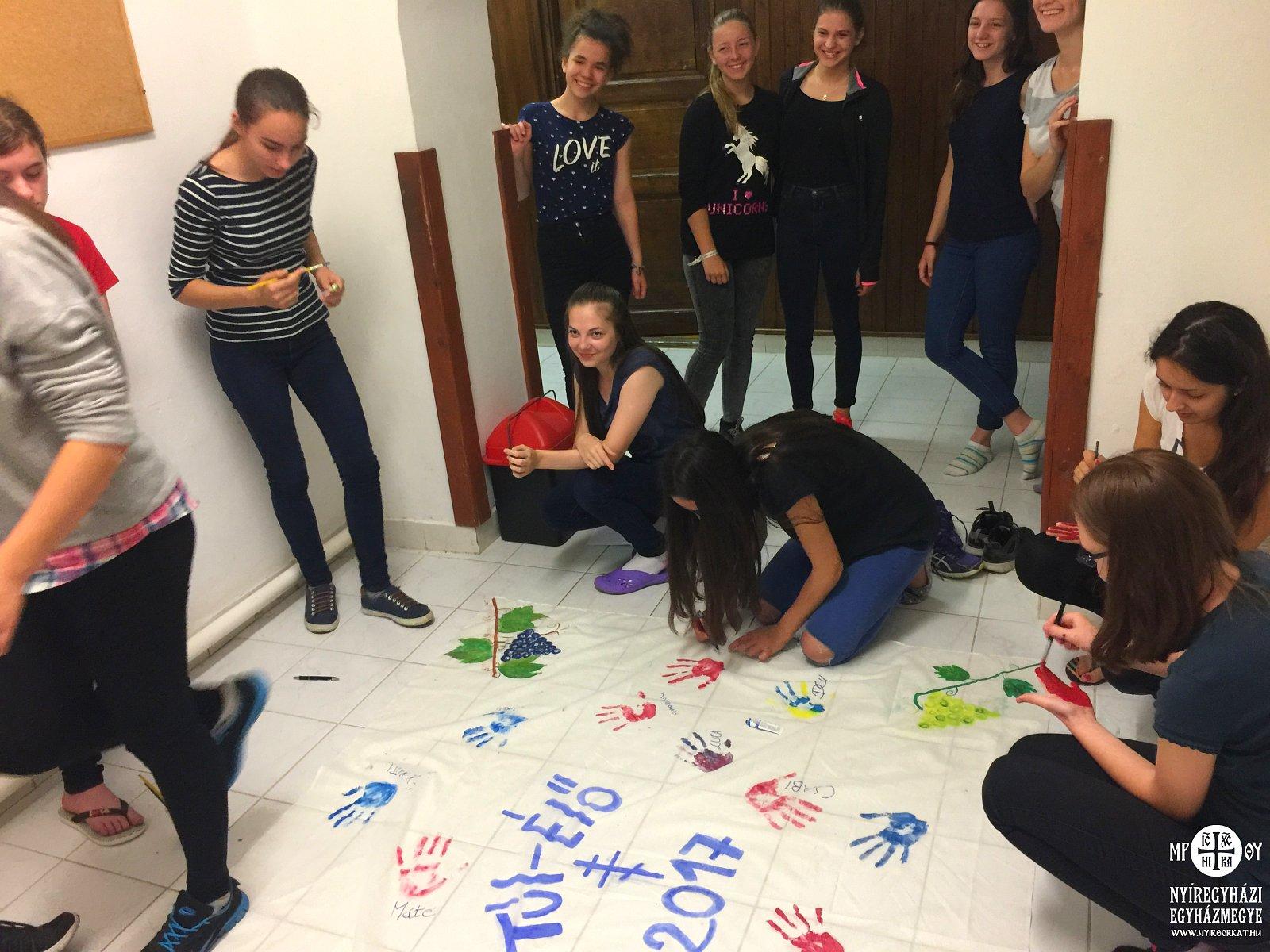 „Péntek éjfél környékén, megéhezve, az este főzött paprikáskrumplit majszoltuk a szállás előtt egy kis padon ülve, ketten. Aztán pár pillanat alatt már tizenketten. Egy kötetlen beszélgetés alakult ki hirtelen Csaba atyával együtt. Talán kimondhatom, hogy a paprikáskrumpli volt az, ami nem csak a tábor eleje volt, de a barátságainké is. Szombaton arra ébredtünk, hogy zuhog az eső. Délelőttre a koliban ragadtunk. Ez nem okozott problémát, mert feltaláltuk magunkat: elkészítettük a tábor molinóját. Eszméletlen, hogy egy egyszerű fehér lepedőből, festékkel és a két kezünkkel mit lehet együtt készíteni. […] Délután izgatott, négy fős csoportokban álltunk, evezővel a kezünkben a kenuk mellett, az oktatást figyelve. A következő, amire emlékszem, hogy négyen egyszerre skandáljuk: „és húzd”, majd egy lélegzetvétel után ismét. Egy jó óra evezés után karjaink már fáradtan pihentek az ölünkben. […] Az evezés, nevetgélés és a víz kiszívott minket, de estére új erőre kaptunk és már Tarcalon is voltunk, hogy megnézzük az Áldó Krisztus szobrot. Megindító volt szó szerint Krisztus lába előtt elmondani az imát.