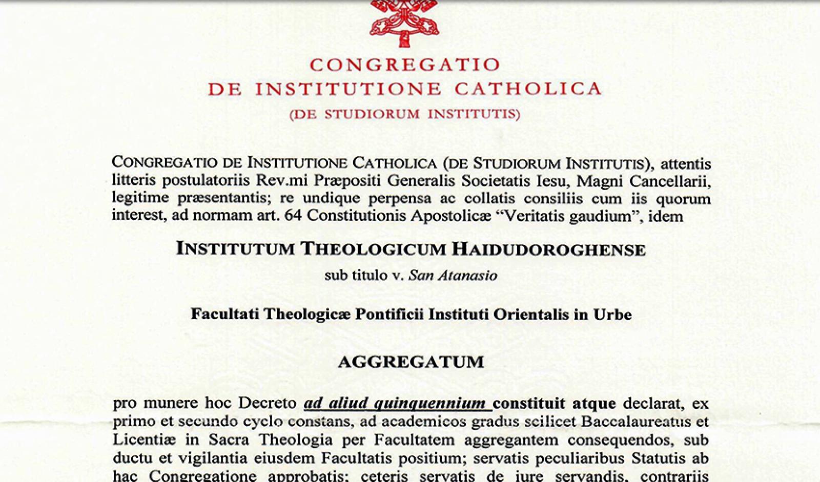 A dekrétum kiadását Massimo Pampaloni atya, a Pápai Keleti Intézet rektorhelyettesének hivatalos látogatása előzte meg, melynek során megvizsgálta, hogy az intézmény teljesíti-e az aggregáció feltételeit. P. Pampaloni jelentése alapján, valamint a mellékelt dokumentáció vizsgálata után döntött a Kongregáció az aggregáció megújítása mellett.