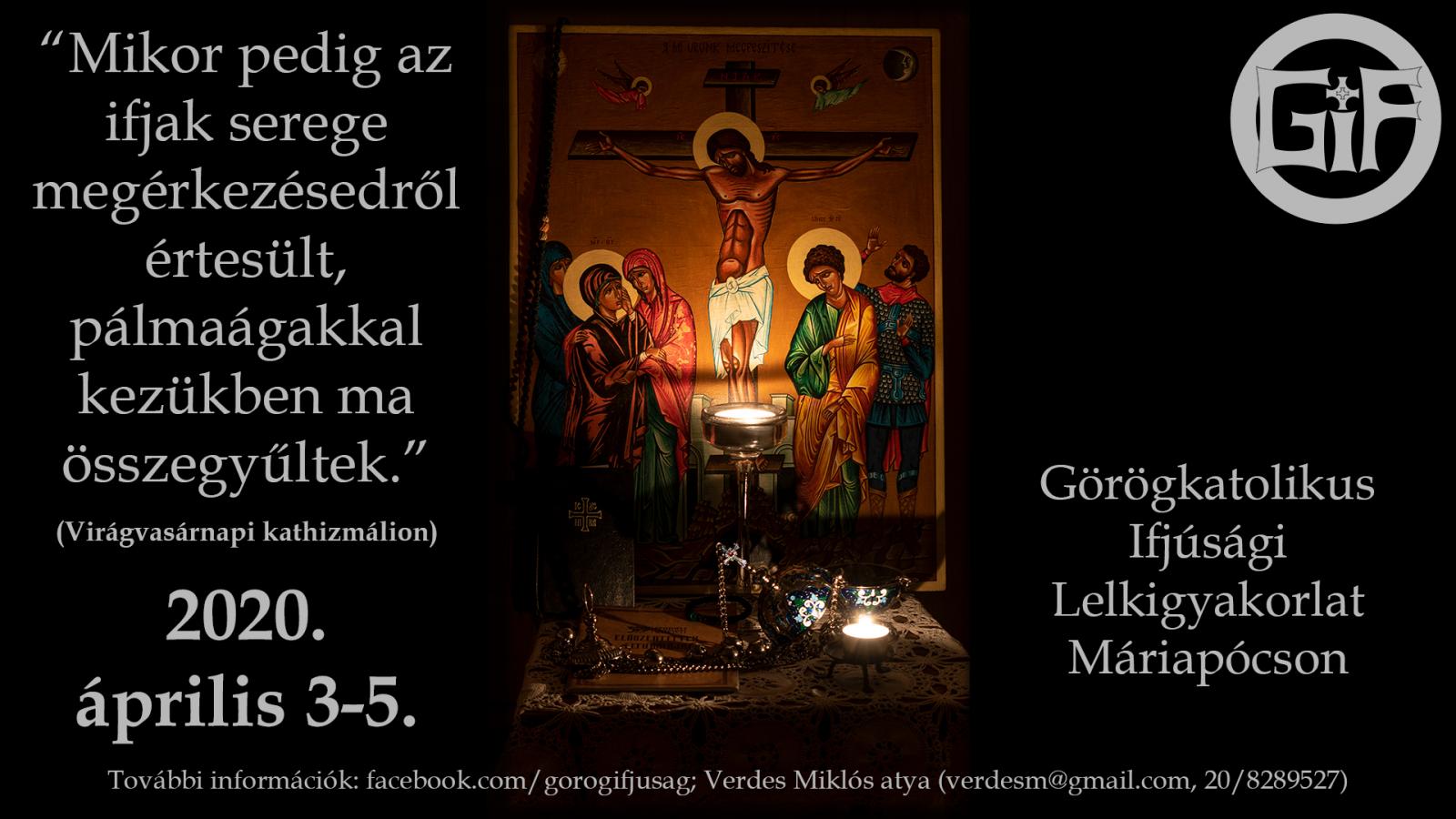 “Mikor pedig az ifjak serege megérkezésedről értesült, pálmaágakkal kezükben ma összegyűltek” fogjuk énekelni a lelkigyakorlat mottóját a virágvasárnapi utrenyében (kathizmálion). Jézus bevonulását közösen ünnepelhetjük meg, készülhetünk a Húsvétra, valamint ápolhatjuk az előző alkalommal kialakított kapcsolatokat, mélyíthetjük a régieket, újakat hozhatunk létre. A programot ismét hasznos és gyakorlati előadások, közösségi és önismereti játékok és az elmaradhatatlan hajnali és éjjeli imádságok és beszélgetések színesítik, gazdagítják.