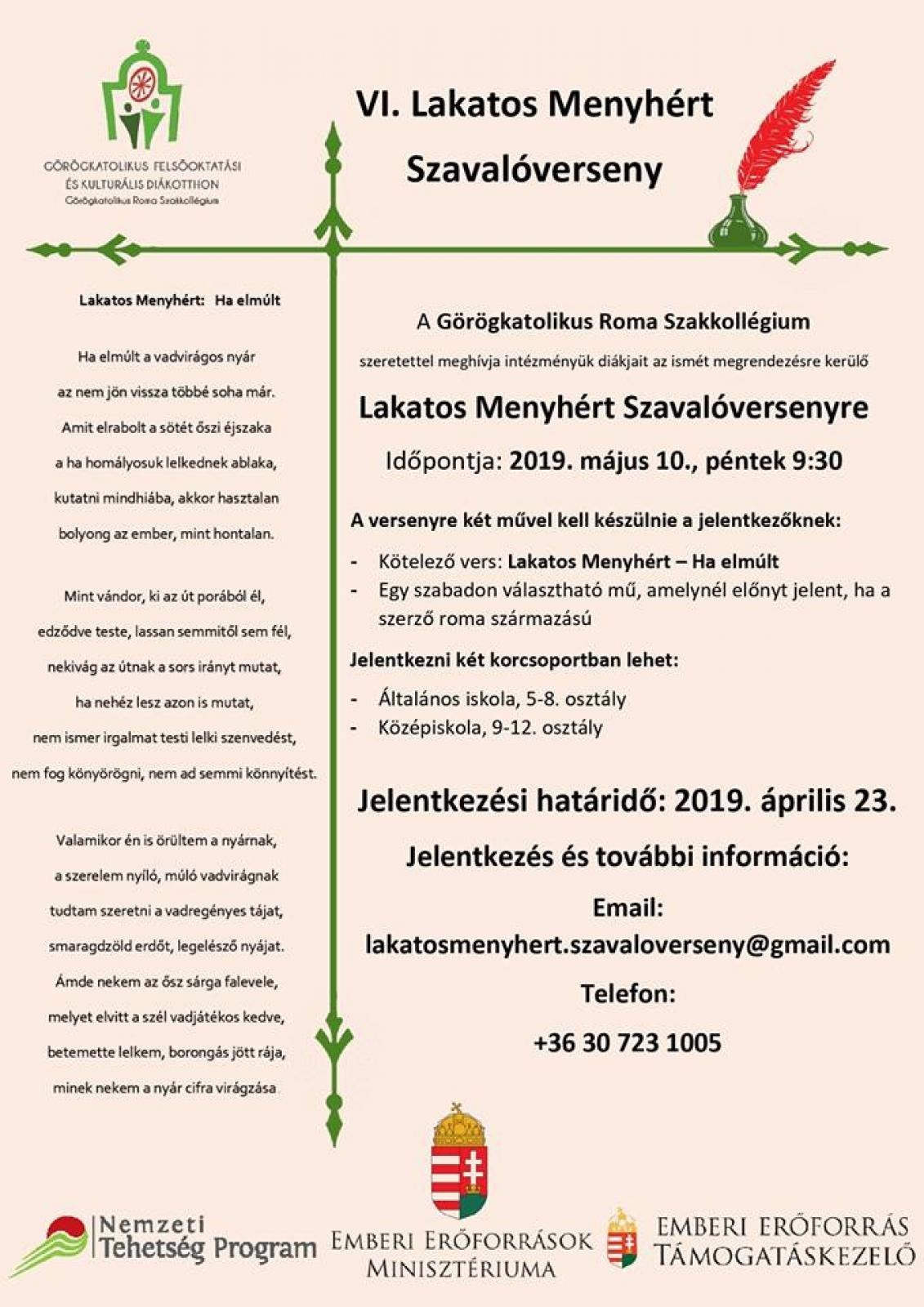 A Görögkatolikus Roma Szakkollégium szeretettel hívja a diákokat a hatodik alkalommal megrendezésre kerülő Lakatos Menyhért Szavalóversenyre.