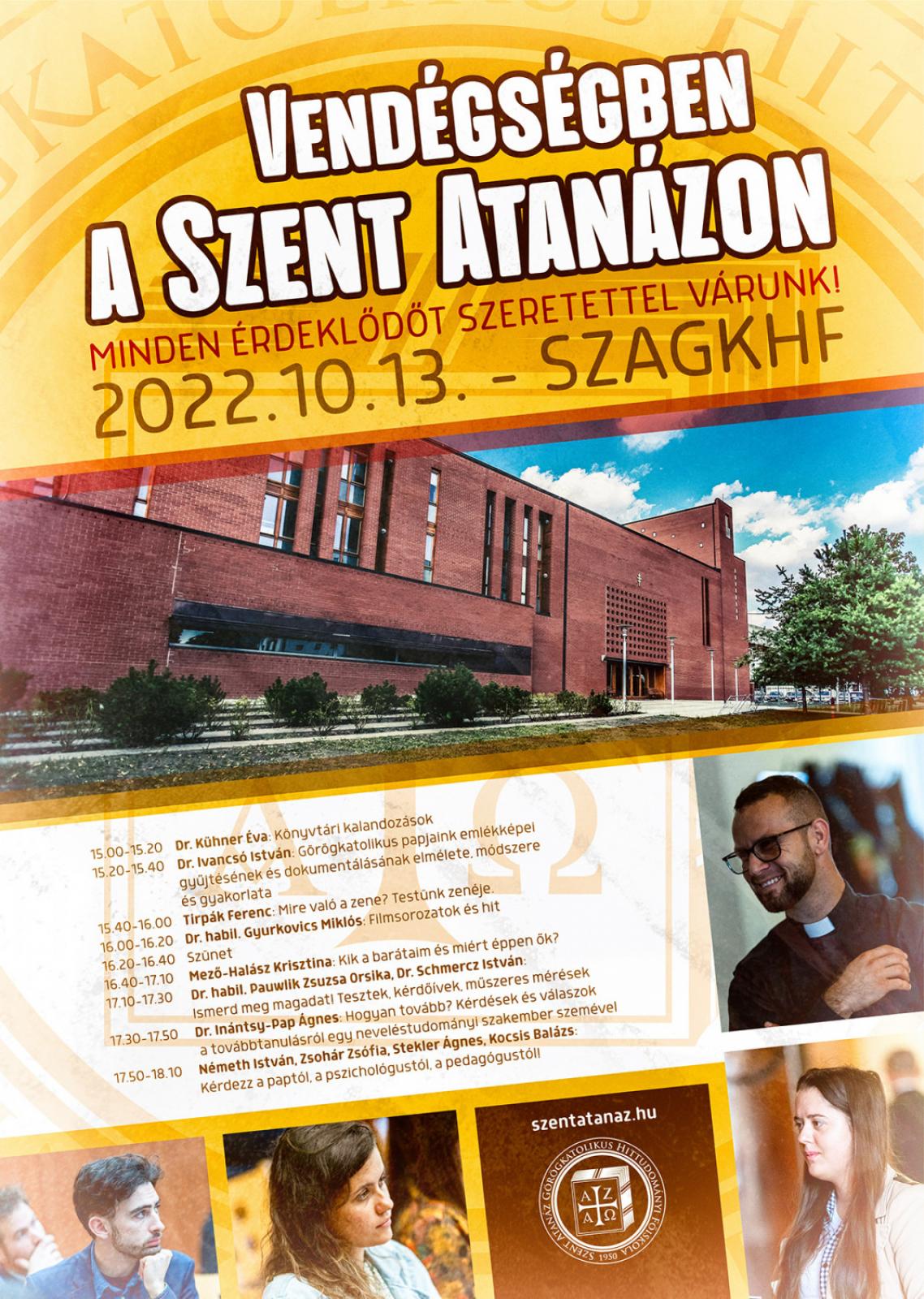 A Szent Atanáz Görögkatolikus Hittudományi Főiskola 2022. október 13-án (csütörtökön) 15:00 órától rendezi meg a Vendégségben a Szent Atanázon programot, mely során a különböző tudományterületeket lehet megismerni interaktív formában. Részletek a plakáton.