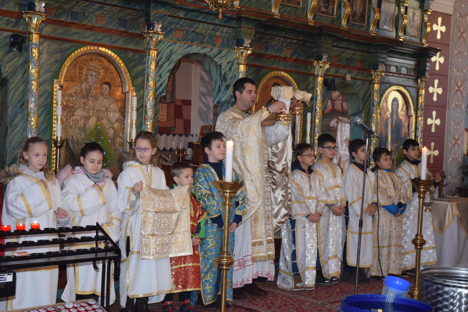 A gyermekek liturgiáját követően Tóth Elek parókus atya a felnőtt hívek népes serege előtt szentelte meg a vizet, melybe először a háromágú gyertyát, majd pedig a keresztet merítette alá háromszor.