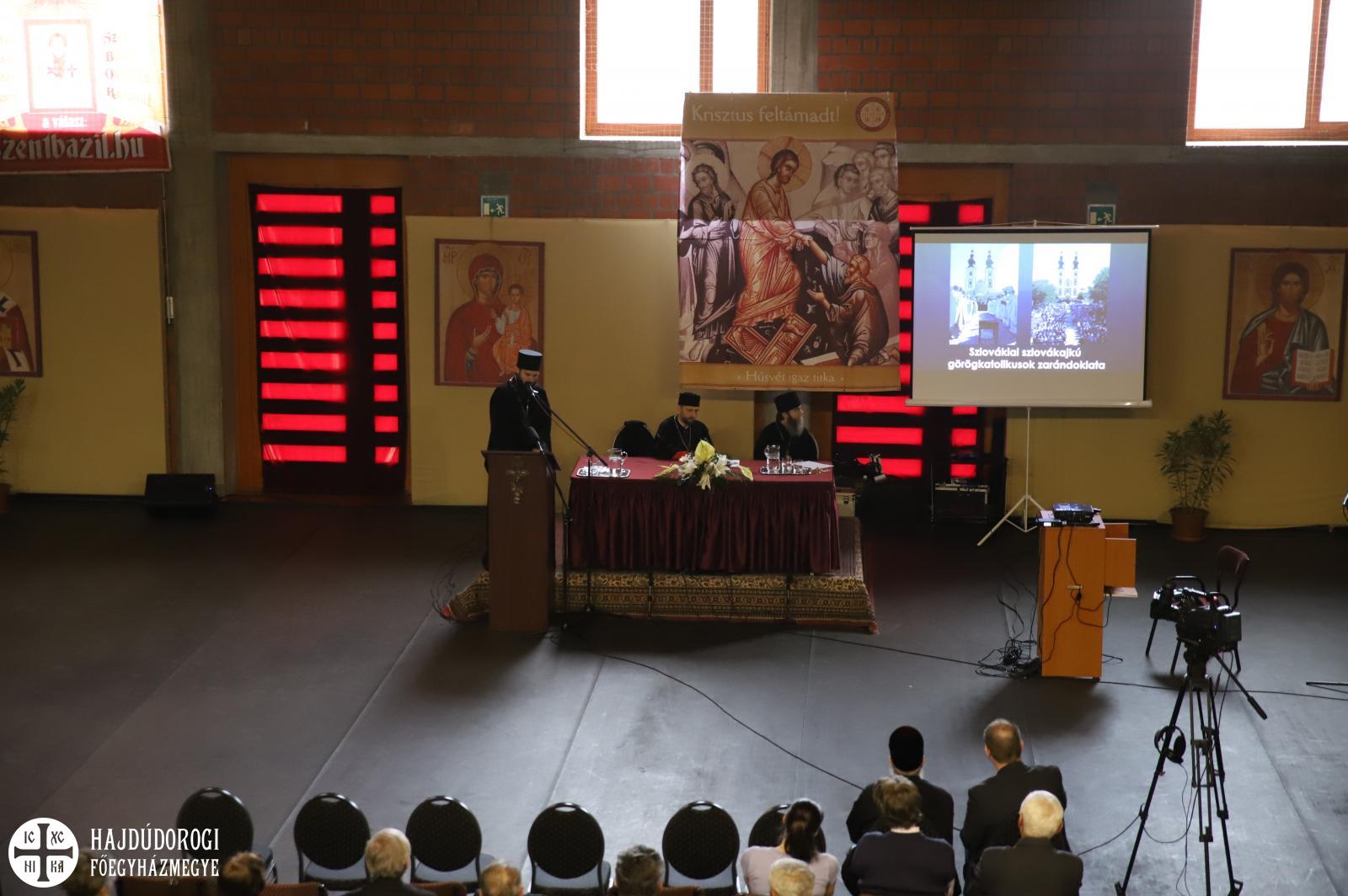 Az előadások sorát a három egyházmegye, három helynöke folytatta. Polgári László nyíregyházi helynök felidézte, hogy a rendszerváltás óta napjainkig 45 egyházközség jött létre és 37 templom épült meg, majd időrendben fel is sorolta, hol és mikor valósultak meg ezek a fontos fejlesztések. Majd Seszták István atya, a Debreceni Helynökség vezetője ismertette „a köszönet és a hála szavával” ennek az időszaknak terméseként az intézményhálózat bővülését. „Nagyon hálásak lehetünk, hogy az elődeink reményeit, álmait a Jóisten gondviselése folytán megélhetjük.” – mondta. Emlékeztetett, hogy az első katolikus átvett intézmény a rendszerváltás után éppen a hajdúdorogi általános iskola volt, ezt követően itt a településen, majd Nyíregyházán és Miskolcon jöttek létre azok az intézmények, amik jó alapot jelentettek a terjeszkedéshez. 2009-től egy igazi „oktatási dömping” indult be, azóta szinte megszámlálhatatlan mennyiségű görögkatolikus óvoda és iskola kezdte meg működését. Ennek eredménye, hogy több mint 10 ezer diák tanul ezek között a falak között.