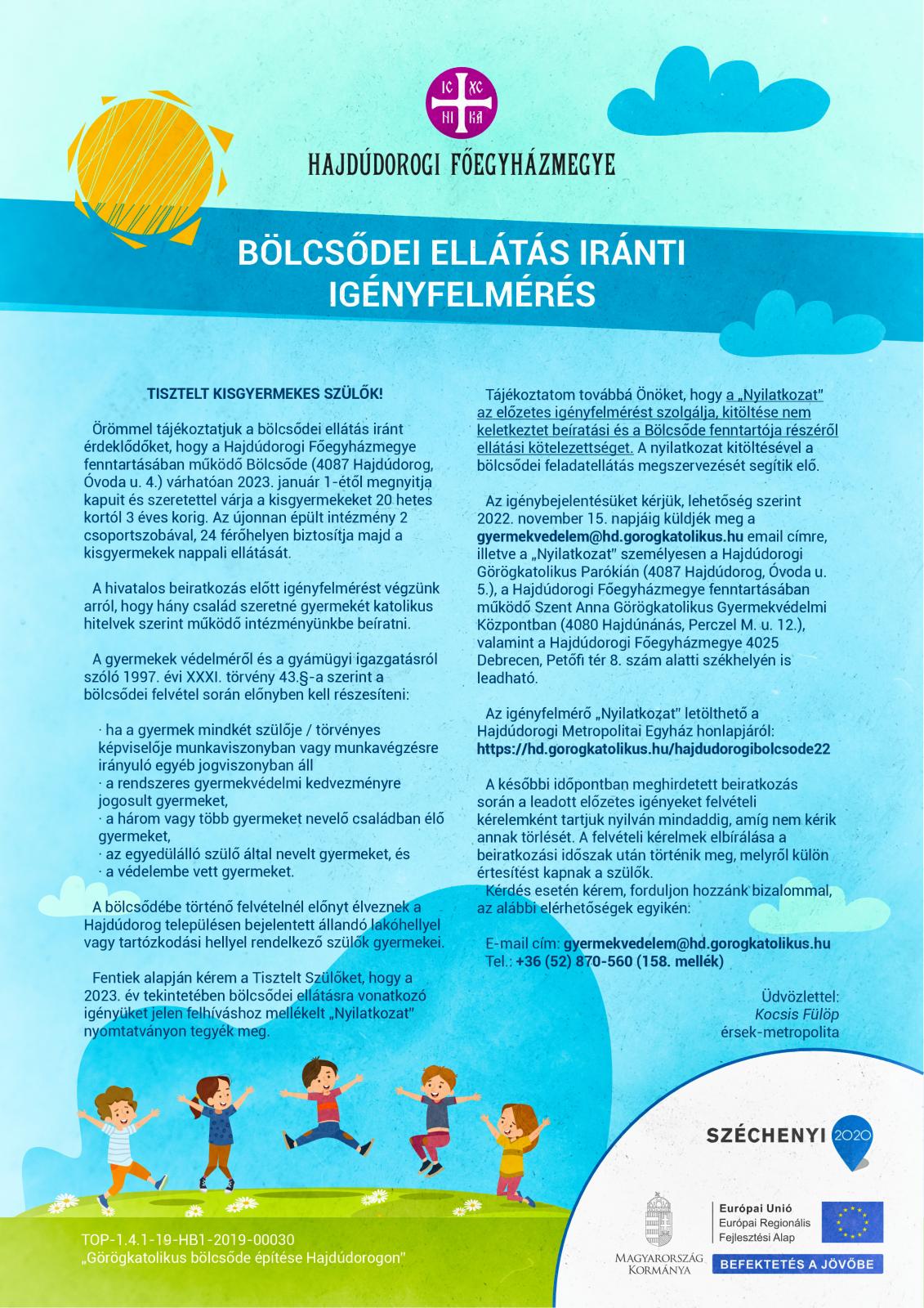 A Hajdúdorog, Óvoda u. 4. szám alatt található, újonnan épült Bölcsőde várhatóan 2023. január 1-étől megnyitja kapuit és szeretettel várja a kisgyermekeket 20 hetes kortól 3 éves korig. Az intézmény két színes és játékokkal teli csoportszobával, 24 férőhelyen biztosítja majd a kisgyermekek nappali ellátását. A bölcsődei ellátás iránt érdeklődők a hír végén, a kapcsolódó média részben találják az „Igényfelmérő Nyilatkozatot”, melyet a gyermekvedelem@hd.gorogkatolikus.hu e-mail címre küldhetnek el, illetve személyesen is leadhatják az alábbi helyszíneken:
