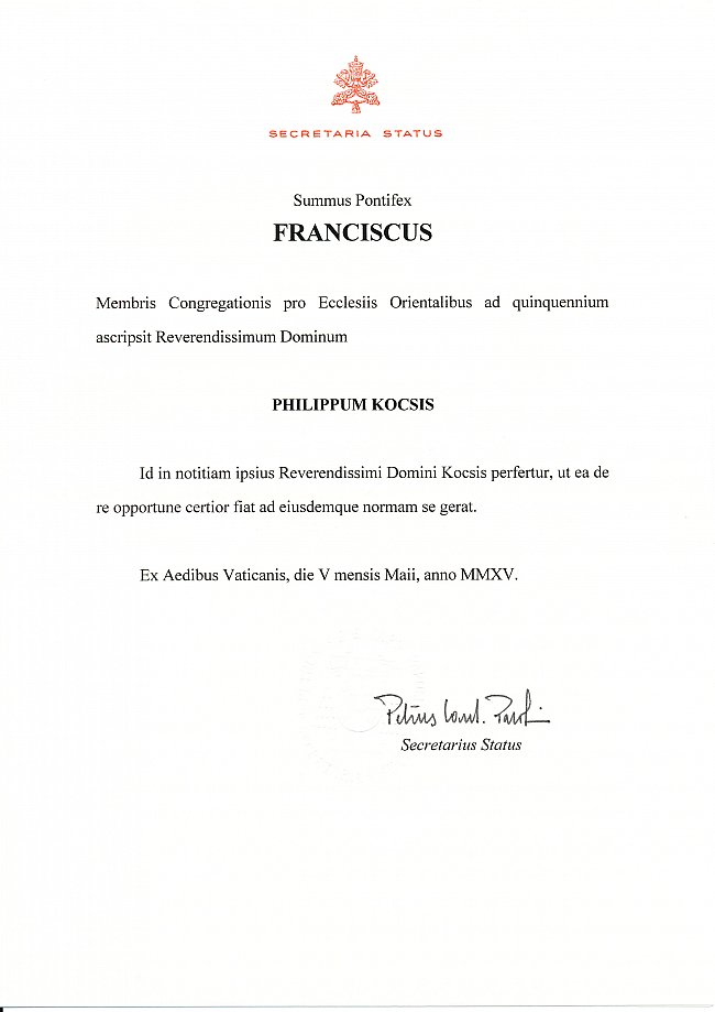 Őszentsége Ferenc pápa 2015. május 5-én Kocsis Fülöp érsek-metropolitát öt évre kinevezte a Keleti Egyházak Kongregációjának tagjává.