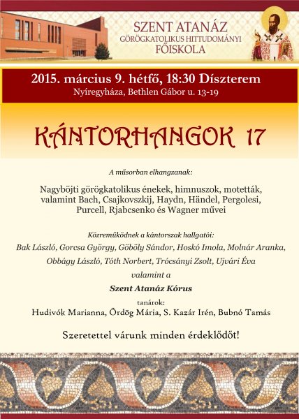 A Kántorhangok sorozat részeként újabb koncertet rendeznek a Szent Atanáz főiskolán március 9-én, melynek keretében nagyböjti görögkatolikus énekek, himnuszok, motetták, valamint Bach, Csajkovszkij, Haydn, Händel, Pergolesi, Purcell, Rjabcsenko és Wagner művei hangzanak el.