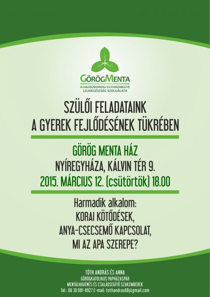 Szülői feladataink a gyerek fejlődésének tükrében címmel folytatódik a már megkezdett előadássorozat Nyíregyházán a Görög Menta Házban, mely keretében a következő alkalommal a korai kötődés, az anya-csecsemő kapcsolat és az apa szerepét ebben a kapcsolatban témáját fogják körüljárni az előadók a résztvevőkkel közösen.