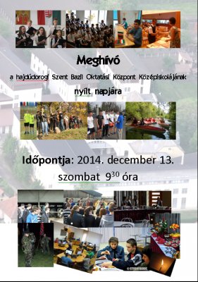Nehéz feladat szülőként gyermekeink jövőjéről felelősséggel dönteni. E nehéz döntéshez kívánunk segítséget nyújtani bemutatva intézményünket, a hajdúdorogi Szent Bazil Oktatási Központ középiskoláját. Éppen ezért az iskola nyílt napot tart 2014. december 13-án, szombaton 09.30-tól.