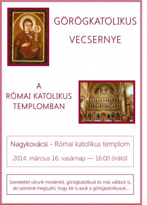 A budaörsi egyházközség folytatja a megkezdett sorozatát, melyben olyan településeket keres fel, ahol az év folyamán egyébként nem végeznek görögkatolikus szertartást. Ezúttal március 16-án vasárnap délután 4 órakor görögkatolikus vecsernyét végeznek a nagykovácsi római katolikus templomban.