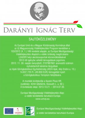 Az Európai Unió és a Magyar Köztársaság kormánya által az Új Magyarország Vidékfejlesztési Program keretében a 103/2012 (X. 1.) VM rendelet alapján, az Európai Mezőgazdasági Vidékfejlesztési Alapból a vidéki örökség megőrzésére LEADER helyi akciócsoportok közreműködésével 2012-től igénybe vehető támogatások jogcímre, 2012. 11. 30. napján benyújtott, 2107887661 azonosító számon nyilvántartott kérelme tárgyában az Ajaki Görögkatolikus Egyházközség (4524 Ajak, Ady Endre u. 13.) 14.637.725 Ft. (49.830 EUR) támogatást nyert a Görögkatolikus Templom felújítására.