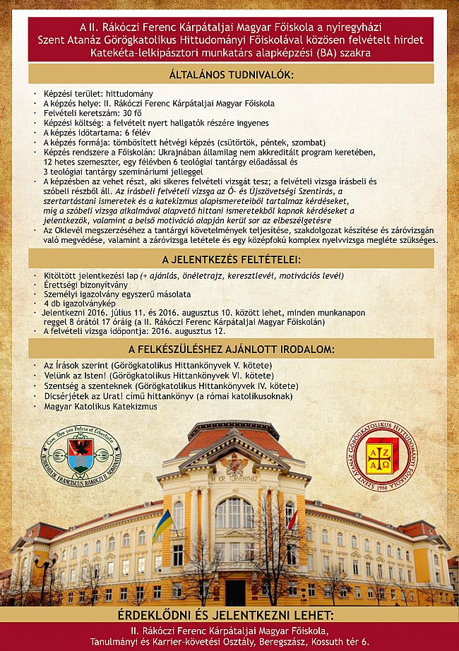 A Szent Atanáz Görögkatolikus Hittudományi Főiskola és a II. Rákóczi Ferenc Kárpátaljai Magyar Főiskola oktatási együttműködés keretében 2016 szeptemberében Katekéta–lelkipásztori munkatárs alapképzési (BA) szakot indítanak Beregszászon.