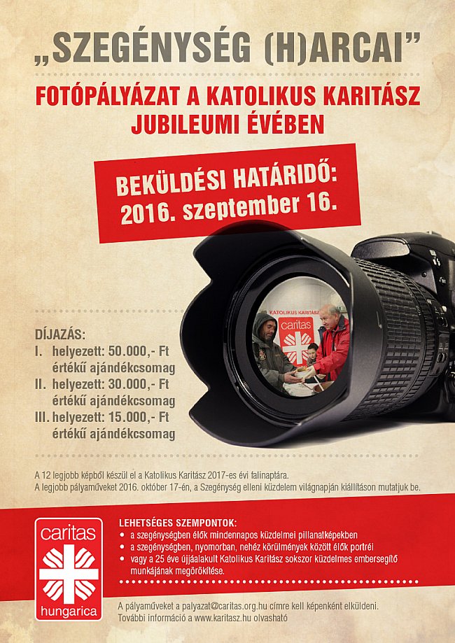 „Szegénység (h)arcai” címmel hirdetnek fotópályázatot a Katolikus Karitász jubileumi évében. A célja, hogy a résztvevők a fényképezés művészi eszközével bemutassák a körülöttük érzékelt, általuk megtapasztalt szegénységet, a szegénységben élő embereket, valamint megmutassák a segítés lehetőségeit, a Katolikus Karitász karitatív tevékenységét és kifejezzék a téma iránti érzékenységüket